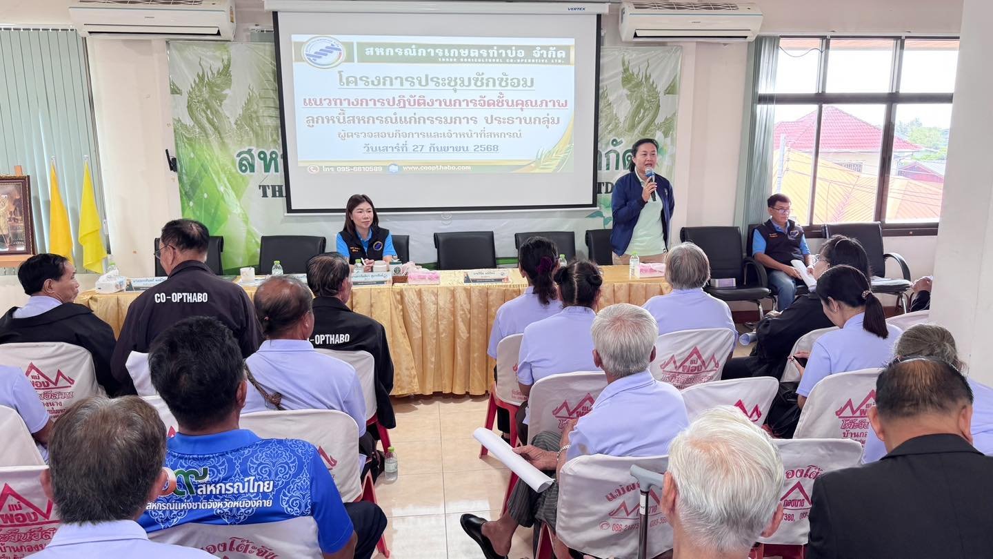 วันเสาร์ที่ 27 กันยายน 2568 สหกรณ์การเกษตรท่าบ่อ จำกัด นำโดยนายปกรณ์ ศรีหาราช ประธานกรรมการนางสาวจิตติยา สุมารสิงห์ ผู้จัดการ พร้อมคณะกรรมการผู้ตรวจสอบกิจการและเจ้าหน้าที่ จัดโครงการประชุมซักซ้อมแนวทางการปฏิบัติงานการจัดชั้นคุณภาพลูกหนี้สหกรณ์แก่ประธานกลุ่มสมาชิก เพื่อนำไปชี้แจงแนวทางการจัดชั้นแก่สมาชิกในกลุ่มสมาชิก เพื่อสร้างวินัยในการส่งชำระหนี้ การมีส่วนร่วมกับสหกรณ์และนำไปสู่การจัดสวัสดิการแก่สมาชิกสหกรณ์